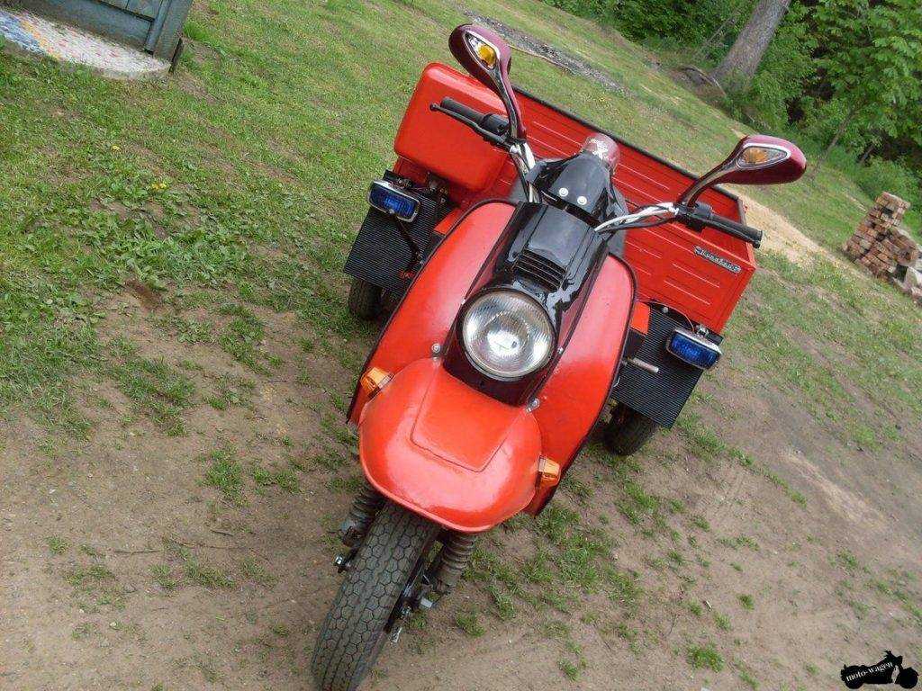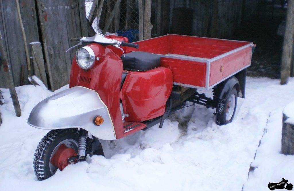 Муравей не только имеет отличную прочность, также у него довольно мощный двигатель. При весе мотороллера в 240 кг за движение отвечает вполне простой, но производительный двигатель на 1 цилиндр и мощностью 11 л.с. За управление отвечает коробка передач на 4 скорости. Кстати, мотоцикл муравей, ремонт которого более чем простой, как вы поняли доступен любому, благодаря отсутствию пластика и защиты имеет возможность не только простого ремонта, но и быстрого. Но теперь не самые утешительные характеристики – показатели расхода топлива. Данный аппарат имеет расход в немалых 8-9 литров на 100 км. Это обусловлено тем, что мотороллеру нужно тянуть крупные грузы, а это заставляет мотор работать еще больше. Как видно на фото, муравей получил багажное отделение закрытого типа, так что можно перевезти багаж, и не переживать что он выпадет. Для более эффективных перевозок можно проверить свои навыки слесаря, добавив увеличенные боковые борты. Закончим технические характеристики данными максимальной скорости – это максимум 30 км в час.