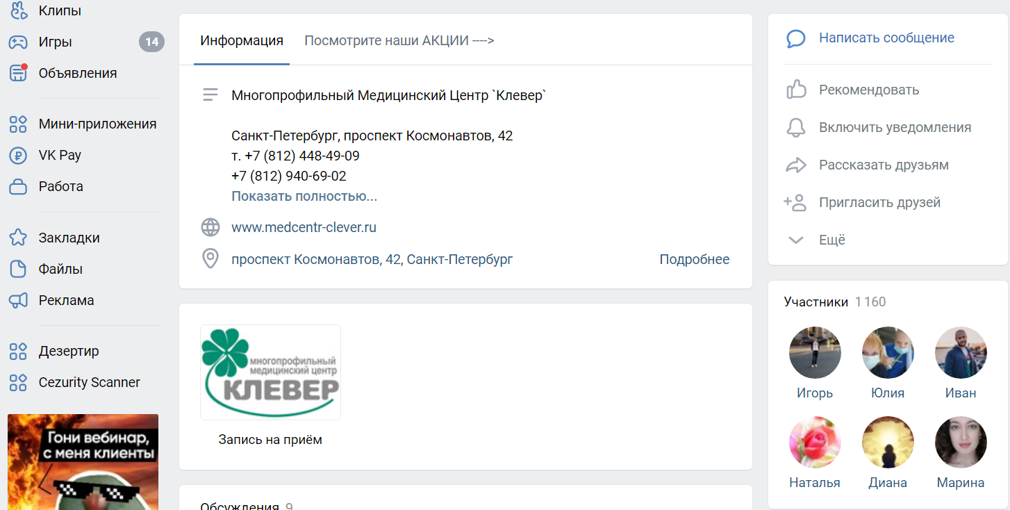 Продающий: информация об акциях, цены на услуги, режим работы клиники.