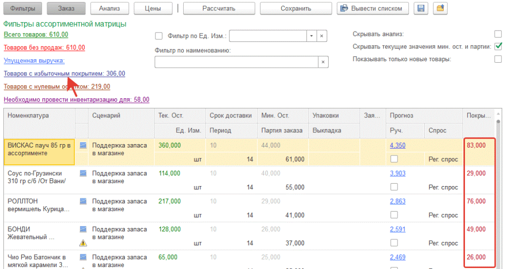 С помощью сервиса «1С Товары» можно найти товары с избыточным покрытием. Речь идет о тех товарах, складских запасов которых хватит на 100 дней продаж и более. Этот показатель в программе гибко настраивается, количество дней можно варьировать. Зная избыточные запасы того или иного товара, в сопоставлении с тем сколько места он занимает на полках или на складе, можно принять обоснованные решения о закупках этих позиций в будущем.