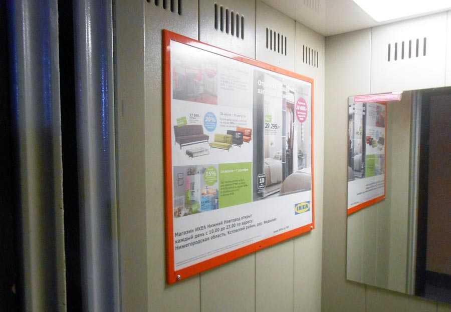 Под рекламой в лифтах можно понимать насколько способов ее размещения. Конкретный вид зависит от технических возможностей в кабине и материального фактора. Рассмотрим самые простые и распространенные варианты для домов, торговых центров и прочих зданий: