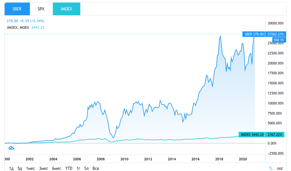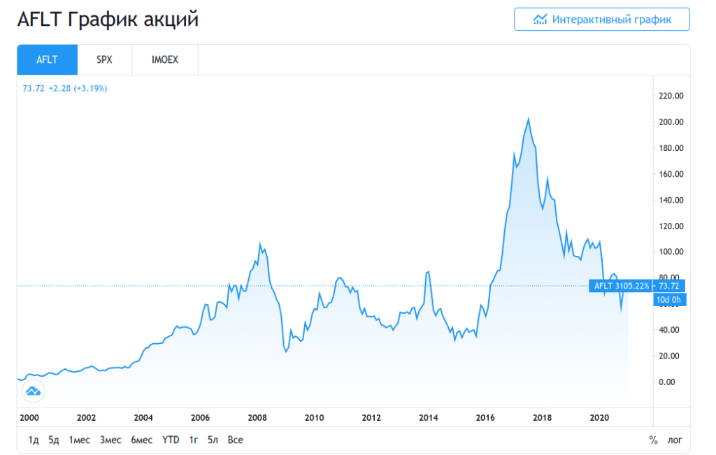 С момента листинга подрос более чем на 3000 %. В самом начале нулевых акции торговались примерно по ₽1,20 за штуку. На момент написания стоят примерно ~73 рубля за акцию.