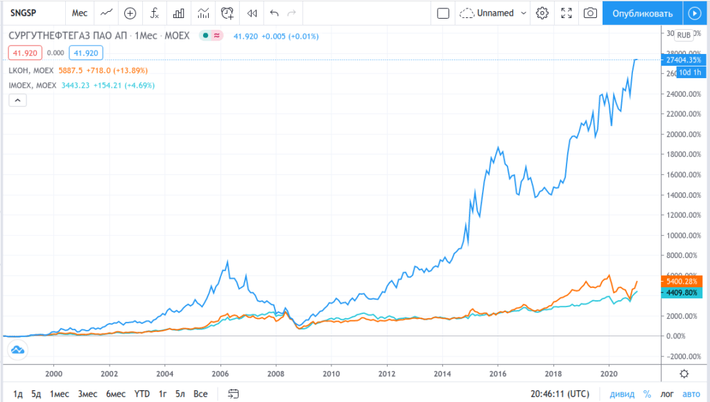 Первая исторической перспективе выросла более чем на 27 000 %. Вторая — почти на 5500 %. Примерно в этих же пределах находится «Славнефть», но почти все ее акции ООО «Инвест-Ойл» (~86,5%) и Select Holdings Limited (~7,7%) и на бирже не торгуются.