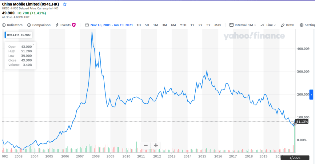 China Mobile (SEHK: 941) — это китайский эквивалент американских AT&T или Verizon. Скучный, но стабильный рынок коммунальных услуг.