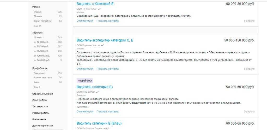 - в транспортных компаниях водителям категории Е обещают зарплату в 40-150 тыс. рублей.