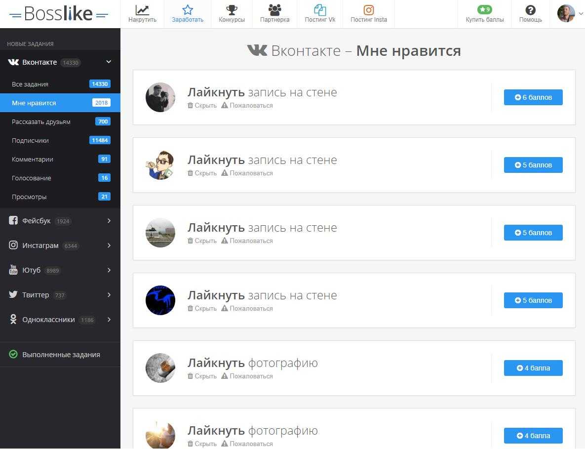 Рассмотрим получение баллов на примере социальной сети Вконтакте. В данной случае, вам доступны 6 видов заданий: мне нравиться, рассказать друзья, подписчики, комментарии, голосование и просмотры.