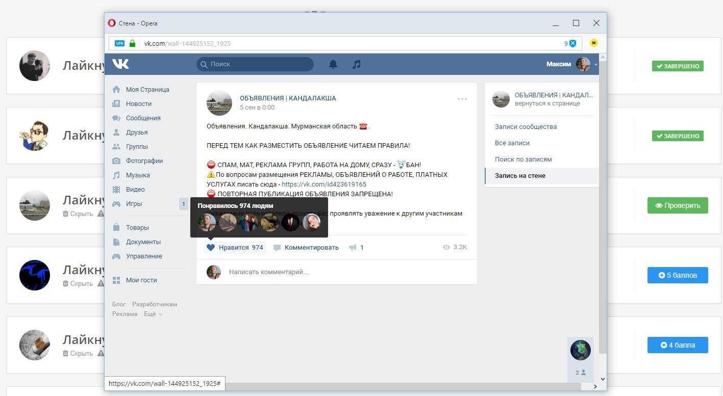 То есть, если Вы не делаете никаких постов на своей стене, не лайкаете то, что попадает в Вашу ленту, не добавляете фотографии и вообще не подаете никаких признаков жизни, тогда добро пожаловать на принудительный отдых на месяц. Выискивать задания с наибольшими вариантами оплаты смысла особого нет, просто выполняйте их все подряд. Нажимая кнопку «Посмотреть задание» Вы попадаете на страницу группы или пользователя, где нужно либо оставить комментарий, либо подписаться, словом ничего нового не требуется. После выполнения, возвращаемся на страницу сервиса и видим такую картинку: