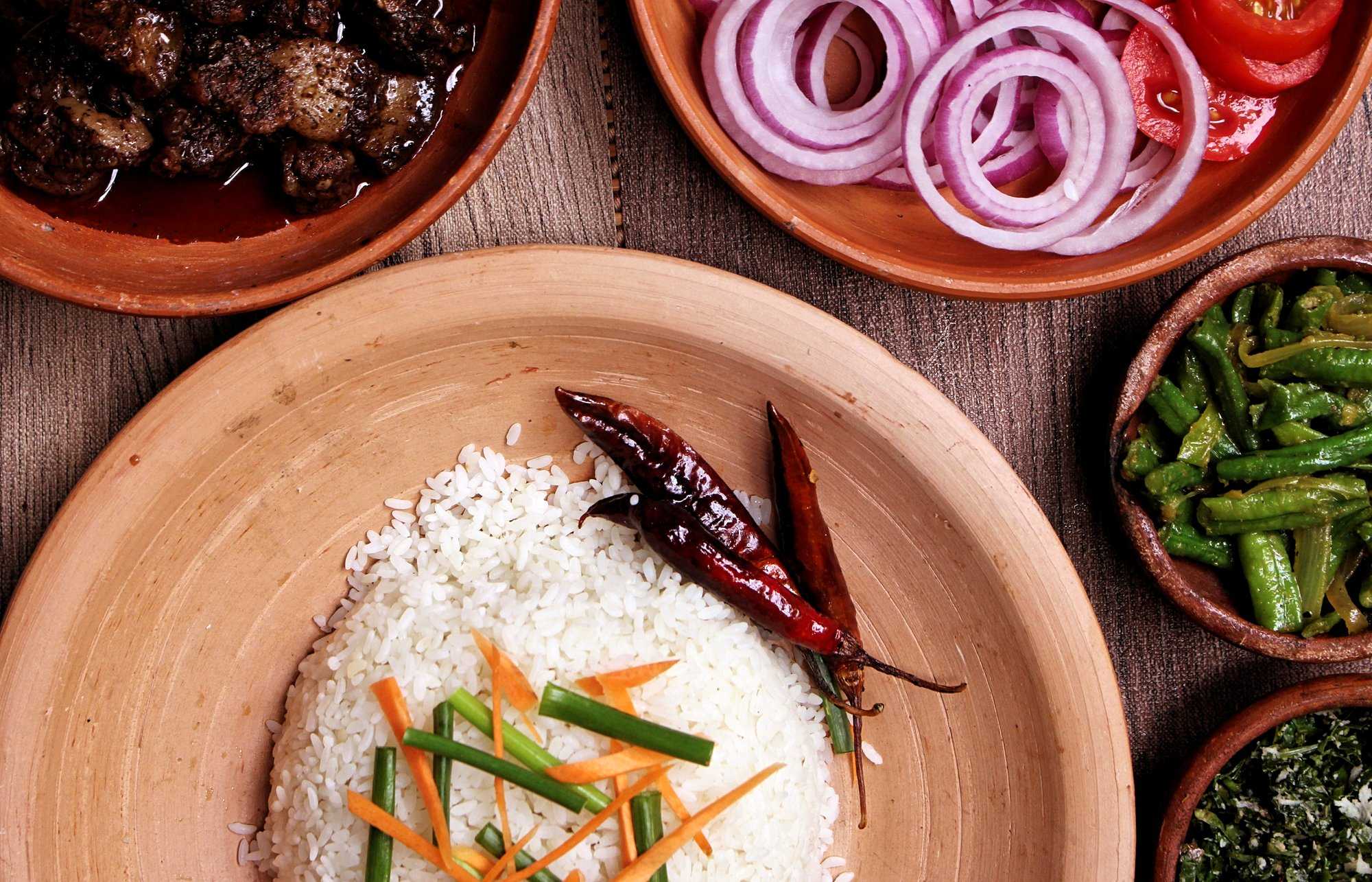 Карри — тарелка риса и множество пиал с овощами, курицей, рыбой, морепродуктами, местными хрустящими чипсами пападам и соусами. Фото: Nilantha Sanjeewa / Unsplash.com