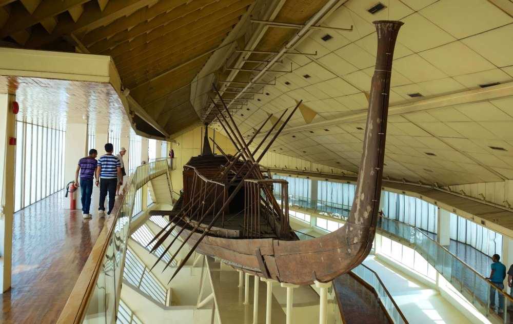 На южной стороне пирамиды – сооружение, напоминающее корабль. Это Солнечная ладья, на которой Хеопс отправился в потусторонний мир. В 1954 году ладья длиной 43,6 м, разобранная на 1224 части, обнаружена при раскопках. Построенная из кедра без единого гвоздя, лодка перед смертью Хеопса еще плавала по Нилу, о чем говорят следы ила на дне.