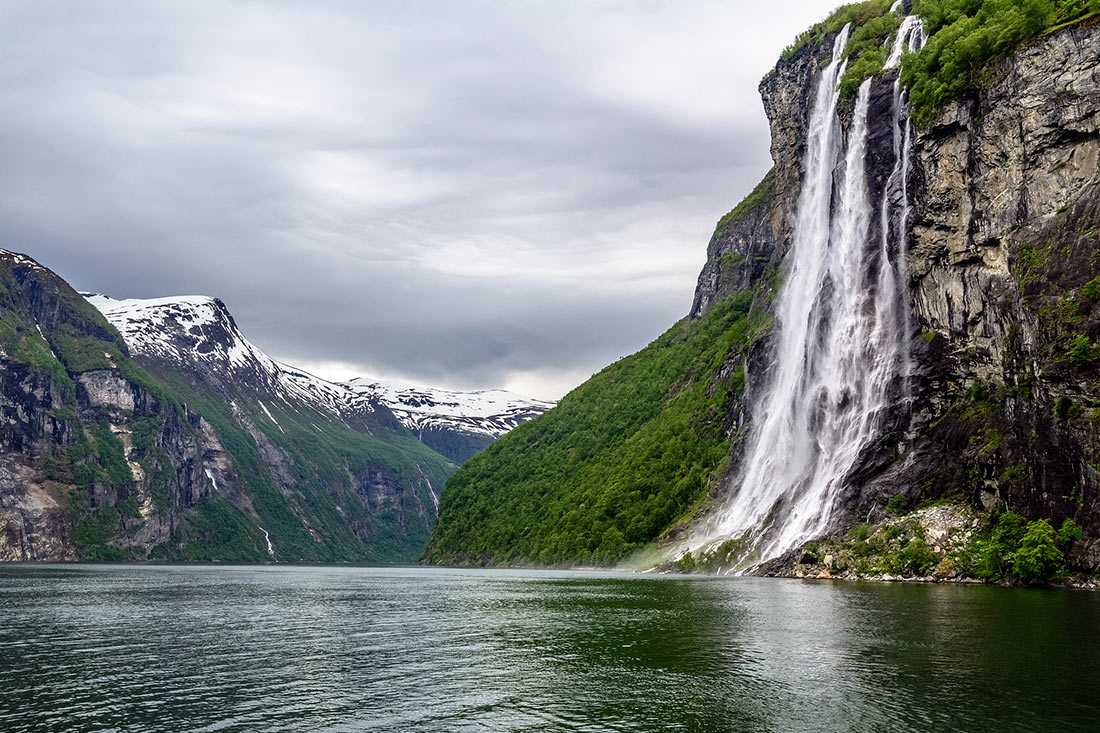 Гейрангер-фьорд – один из самых посещаемых фьордов в Норвегии. А все из-за глубоких синих вод и величественных гор. В программу тура входит обязательный круиз по фьорду, чтобы была возможность увидеть не только его красоту, но и знаменитые водопады Семь сестер, которые падают прямо в фьорд. Напротив них находится водопад под названием Жених, который, как говорят, пытается добиться расположения сестер.