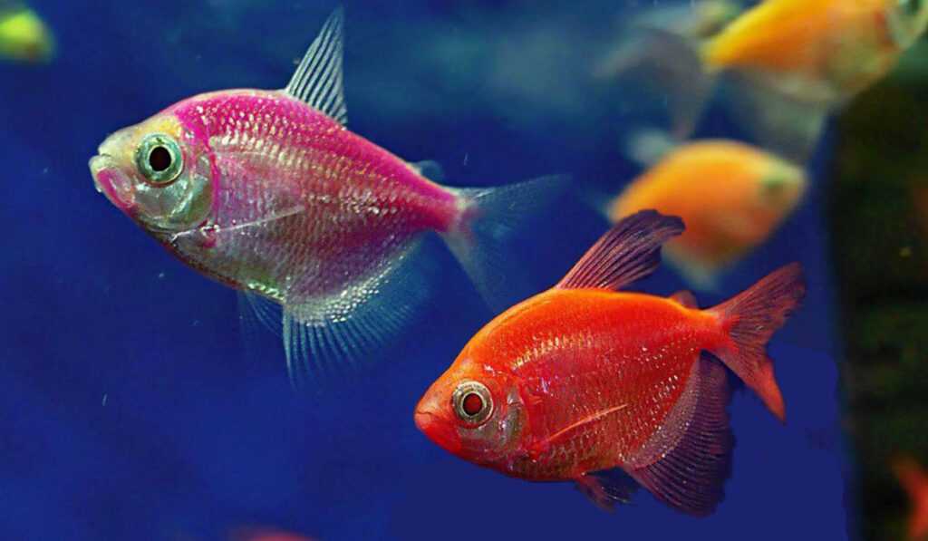 У тернеции глофиш встречаются такие цвета: оранжевый, розовый, красный, синий. А в самой новой селекции у них плавники приобрели вуалевидный тип.