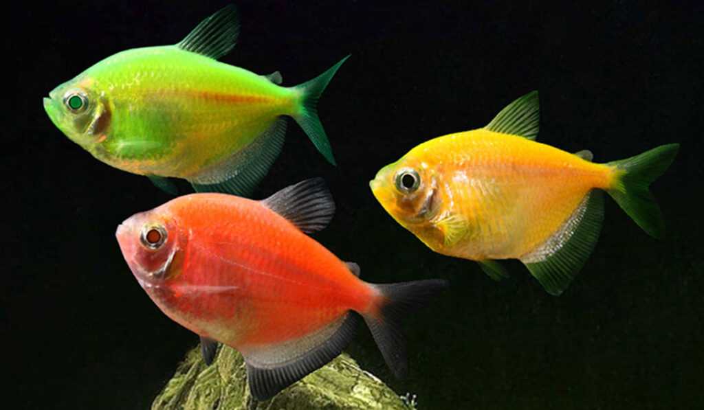 Так как эксперимент по внедрению гена, отвечающего за свечение, оказался успешным, то эту особенность стали пробовать внедрять в различные виды рыб. Теперь на первый план вышла потребность в заселении аквариума светящимися рыбами разных пород. Тернеция — рыбка, которая благодаря округлой форме тела и красивым плавникам стала второй претенденткой на звание глофиш. Отличить эту особь можно по: