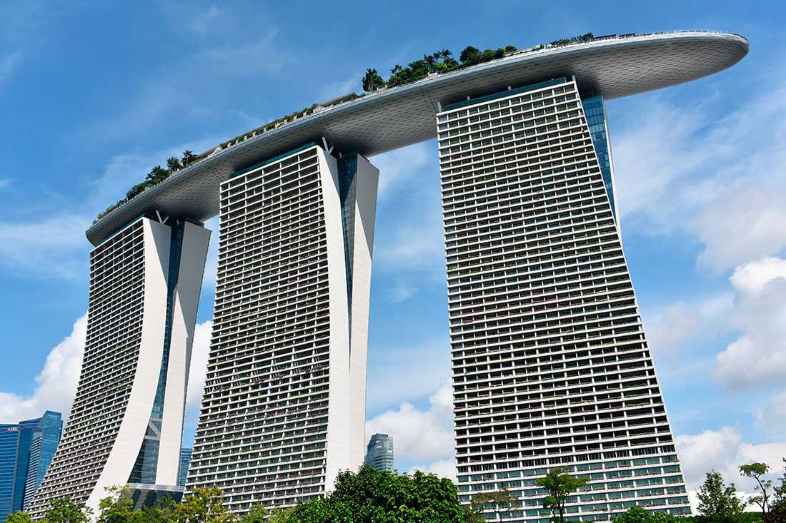 Из окон 2500 номеров отеля «Marina Bay Sands» открывается вид на Южно-Китайское море или залив Марина-Бэй. Сам отель представляет собой довольно интересное с архитектурной точки зрения сооружение.