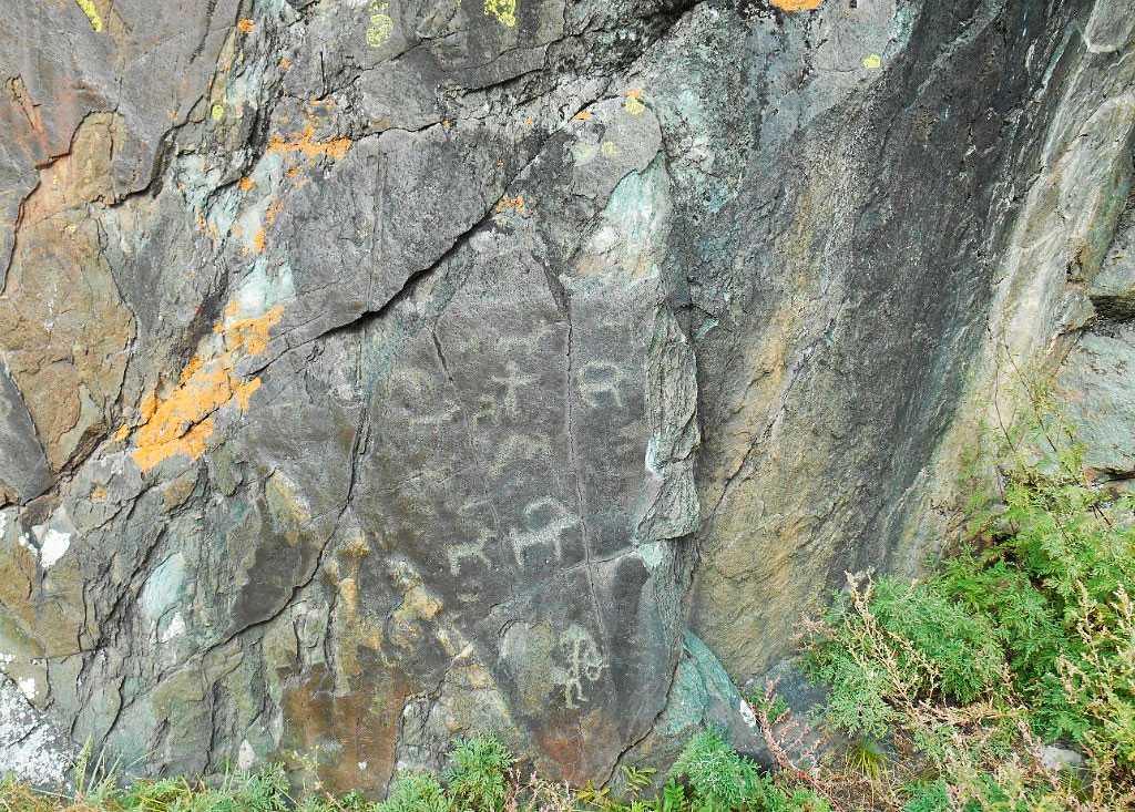 Изображения оленей, лосей, быков, козлов, каких-то фантастических животных видны здесь практически повсюду. Специалисты насчитали в этом районе около 200 различных петроглифов, основная масса которых датируется эпохой бронзы.