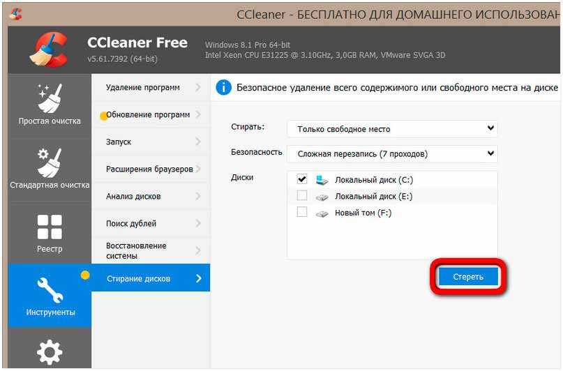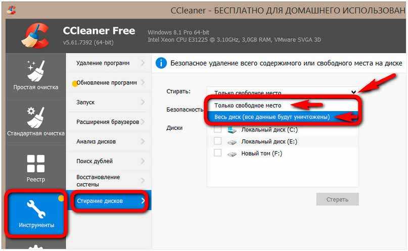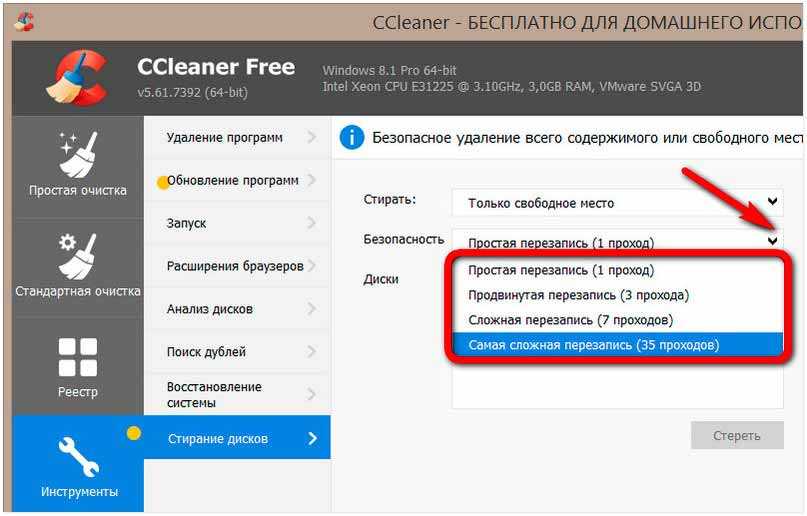Для полного стирания данных можно выбрать любой съёмный носитель или любой раздел диска. Но, естественно, только не раздел с Windows. Программа предусматривает 3 метода перезаписи в 1, 3, 7 и 35 проходов. Отправляемся в раздел CCIeaner «Инструменты». Выбираем «Стирание дисков». Указываем, хотим мы стереть только свободное место или весь диск.