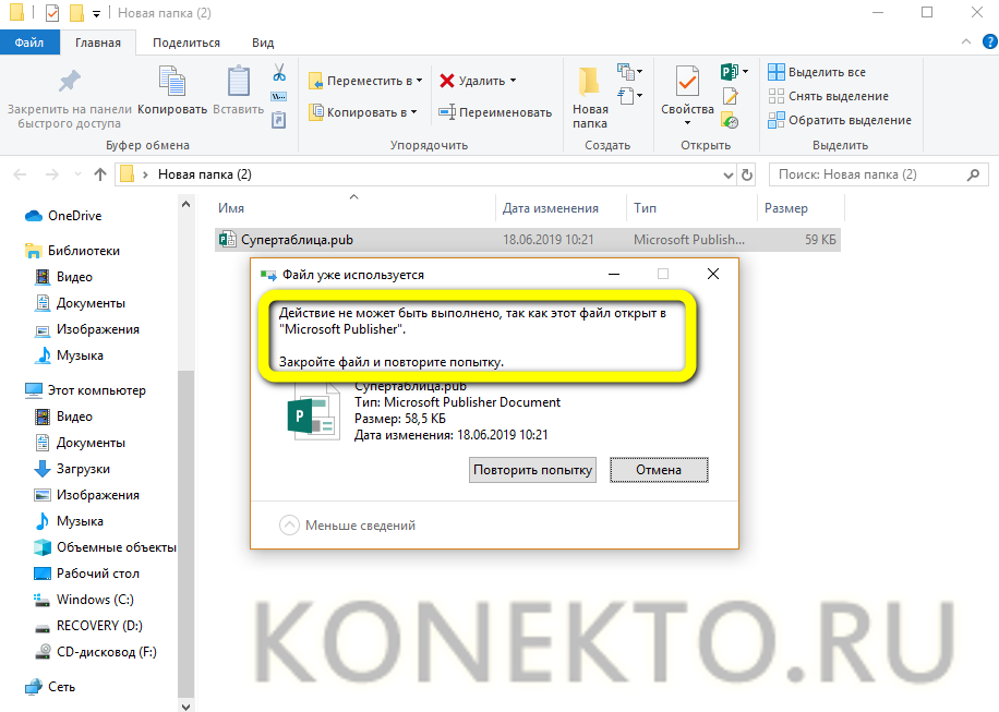 Внимательно прочитать в диалоговом окне, что именно служит причиной ошибки. В приведённом примере файл не удаляется, потому что открыт в программе-редакторе; следовательно, чтобы удалить его, нужно закрыть прогу.
