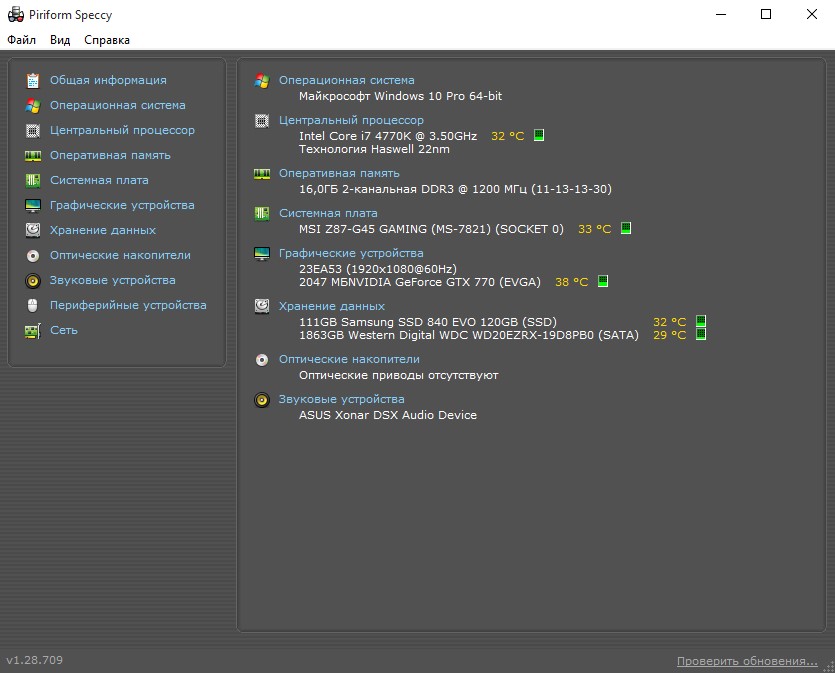 В Speccy указаны подробные характеристики устройств и их текущее состояние