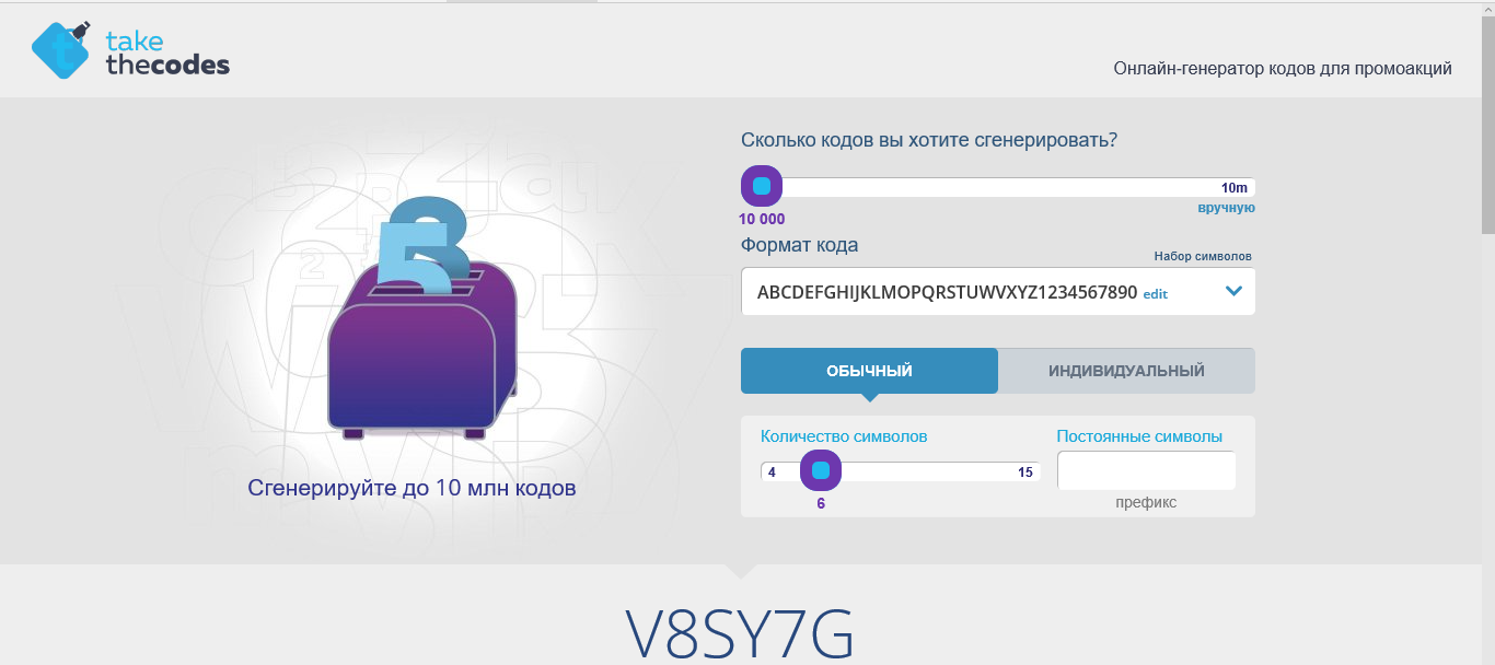 - Можно сгенерировать до 10 миллионов кодов и скачать их в том или ином формате;