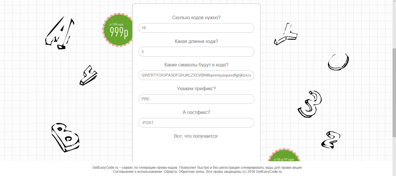 - Генерируется не менее 1000 кодов.