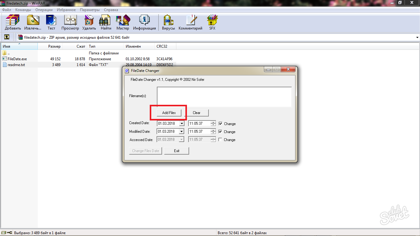 Для примера рассмотрим работу программы FileDate Changer. Программа бесплатная, не требующая установки на компьютер и очень маленькая. Архив с программой и readme-файлом занимает всего 20Кб дискового пространства. Для того чтобы с помощью FileDate Changer изменить дату создания файла выполните следующие шаги.Также изменить дату создания файла позволяют файловые менеджеры с расширенным набором функций такие как FAR или Total Commander.