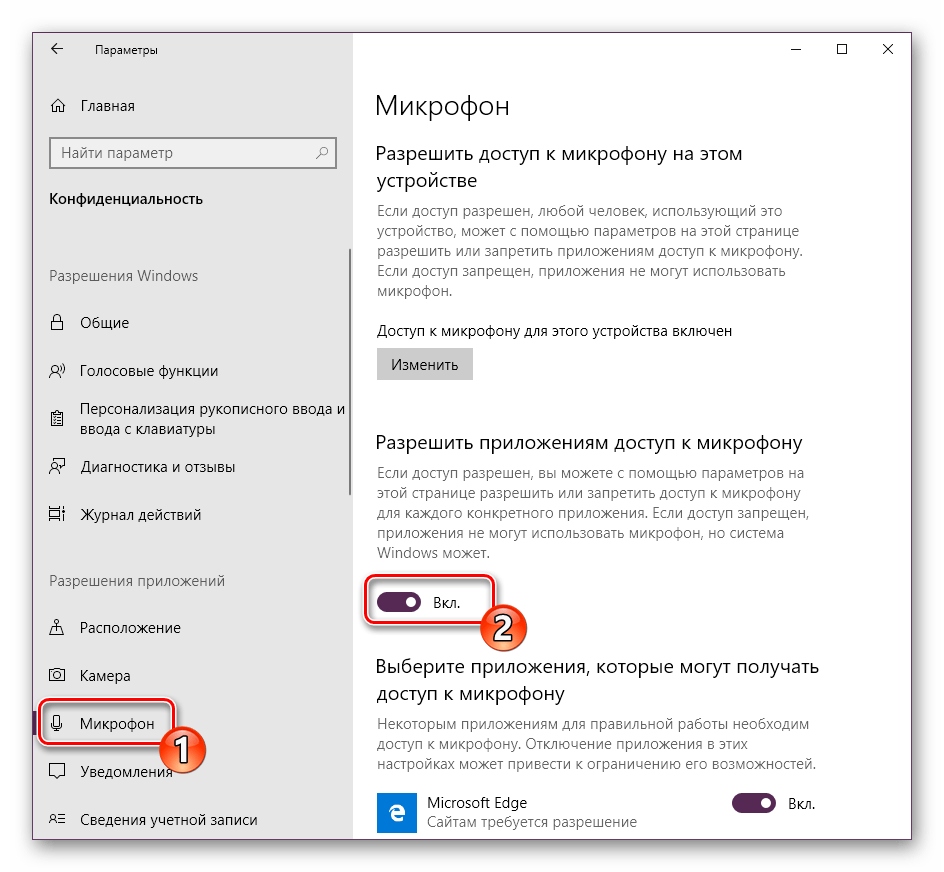 Перемещаем ползунком под пунктом «Разрешить приложениям использовать микрофон» в положение Вкл. Также посмотрите, активирован ли микрофон для тех приложений, в которых вы его хотите использовать.