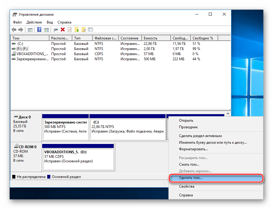 - Щелкните правой кнопкой мышки по тому диску, который Вы хотите удалить, и выберите команду «Удалить том», затем «Да».