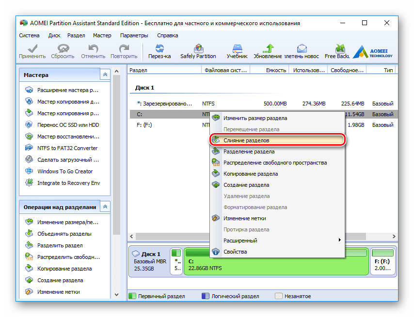 Запустите Aomei Partition Assistant Standard и в главном окне программы нажмите правой кнопкой мыши по любому из двух объединяемых разделов. Выберите пункт меню «Слияние разделов».