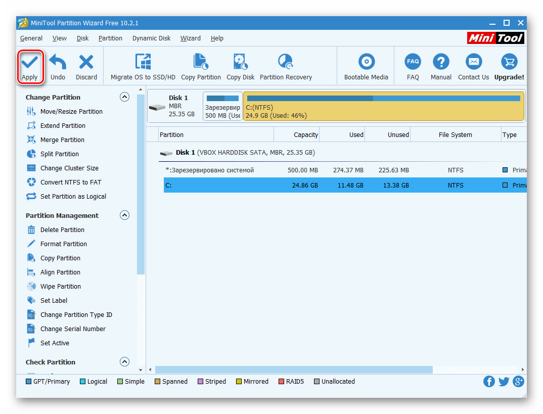 Нажмите Apply на верхней панели и дождитесь, пока программа перераспределит весь объём. Для этого может понадобиться перезагрузка.