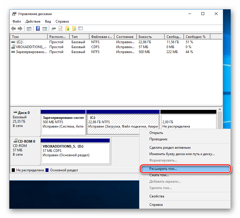 Найдите диск, размер которого хотите увеличить, нажмите по нему правой кнопкой мыши и выберите пункт «Расширить том».