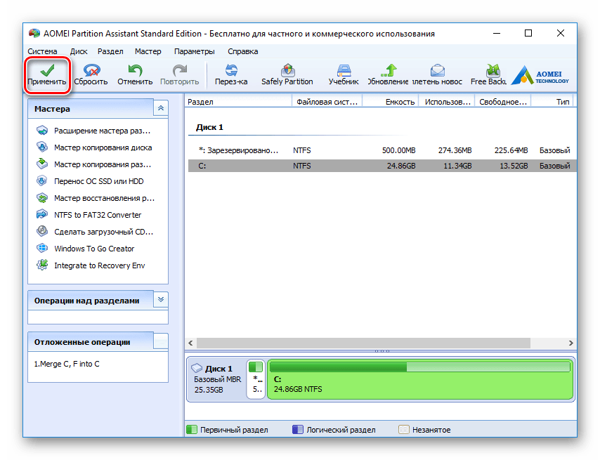 Программа AOMEI Partition Assistant Standard Edition 5.6 работает в режиме отложенной операции и для осуществления наших изменений нужно нажать кнопку “Применить”