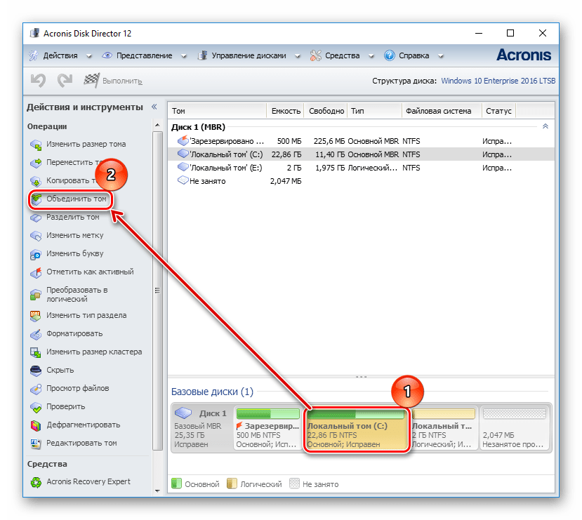 Acronis Disk Director платная, но удобная и многофункциональная программа, поэтому если она есть в вашем арсенале, то соединить тома можно через нее.