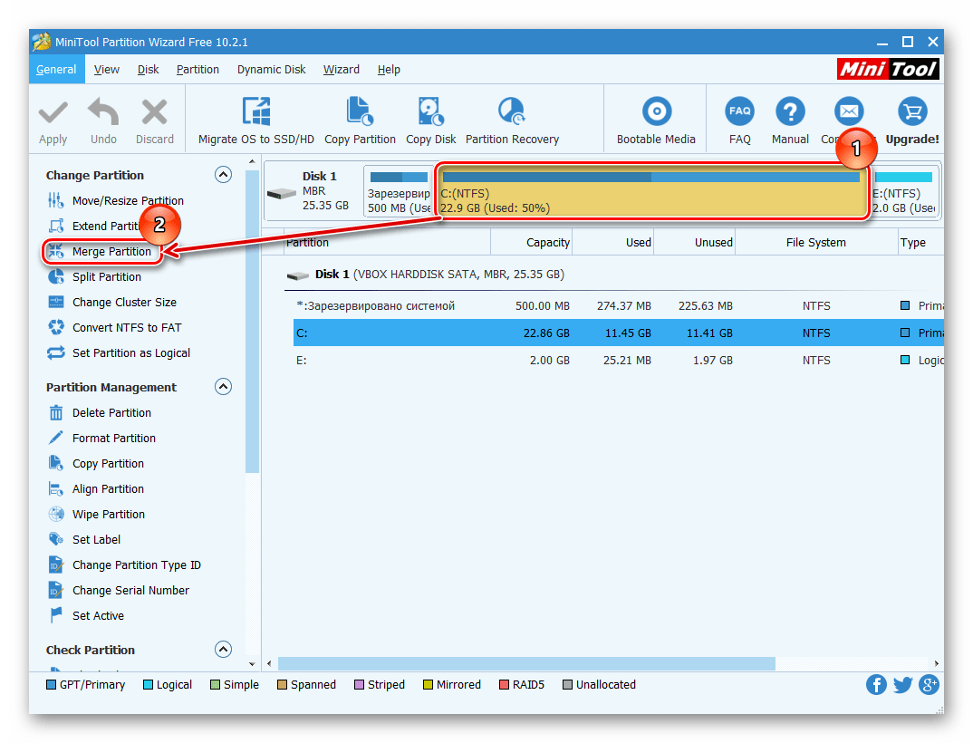 Программа MiniTool Partition Wizard тоже бесплатна, но при этом обладает набором всех необходимых функций. Принцип работы с ней немногим отличается от предыдущей программы, и основными различиями являются интерфейс и язык — у MiniTool Partition Wizard отсутствует русификация. Однако для работы с ней достаточно и базовых знаний английского языка. Все файлы в процессе объединения будут перенесены.