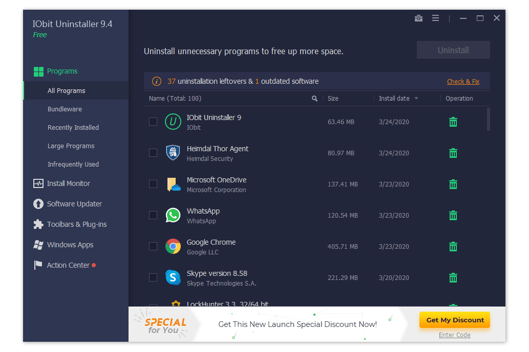С помощью IObit Uninstaller вы можете искать установленное программное обеспечение, находить и удалять программы, которые занимают больше всего места или которые вы вряд ли используете, удалять панели инструментов и плагины браузера, удалять загрузки, сделанные из Центра обновления Windows , и даже видеть, какие из ваших программ могут быть обновлены. на более новую версию.