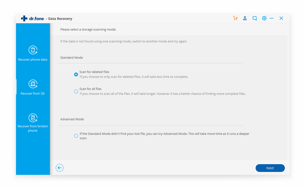 Dr Fone for Android восстанавливает случайно удаленные фотографии на смартфонах и планшетах. В мастере восстановления галочкой нужно отметить Gallery и выбрать Standard или Advanced mode. Во втором случае программа получает полный доступ над файловой системой Андроид, что, теоретически, повышает шансы найти удаленную картинку через приложение. Однако это небезопасно и чревато неприятностями.