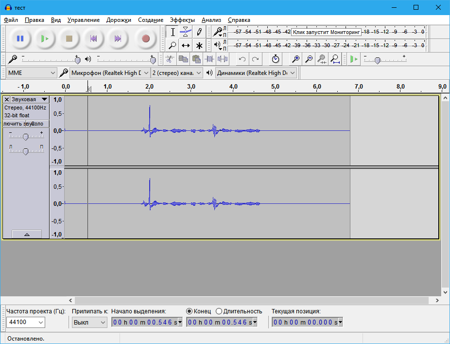 Запись звука с микрофона в Audacity происходит следующим образом.