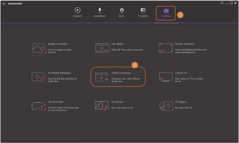 Откройте приложение Wondershare UniConverter (изначально Wondershare Video Converter Ultimate) по сжатию видео на ПК/Mac. Выберите функцию Сжатие Видео из вкладки Ящик для инструментов.